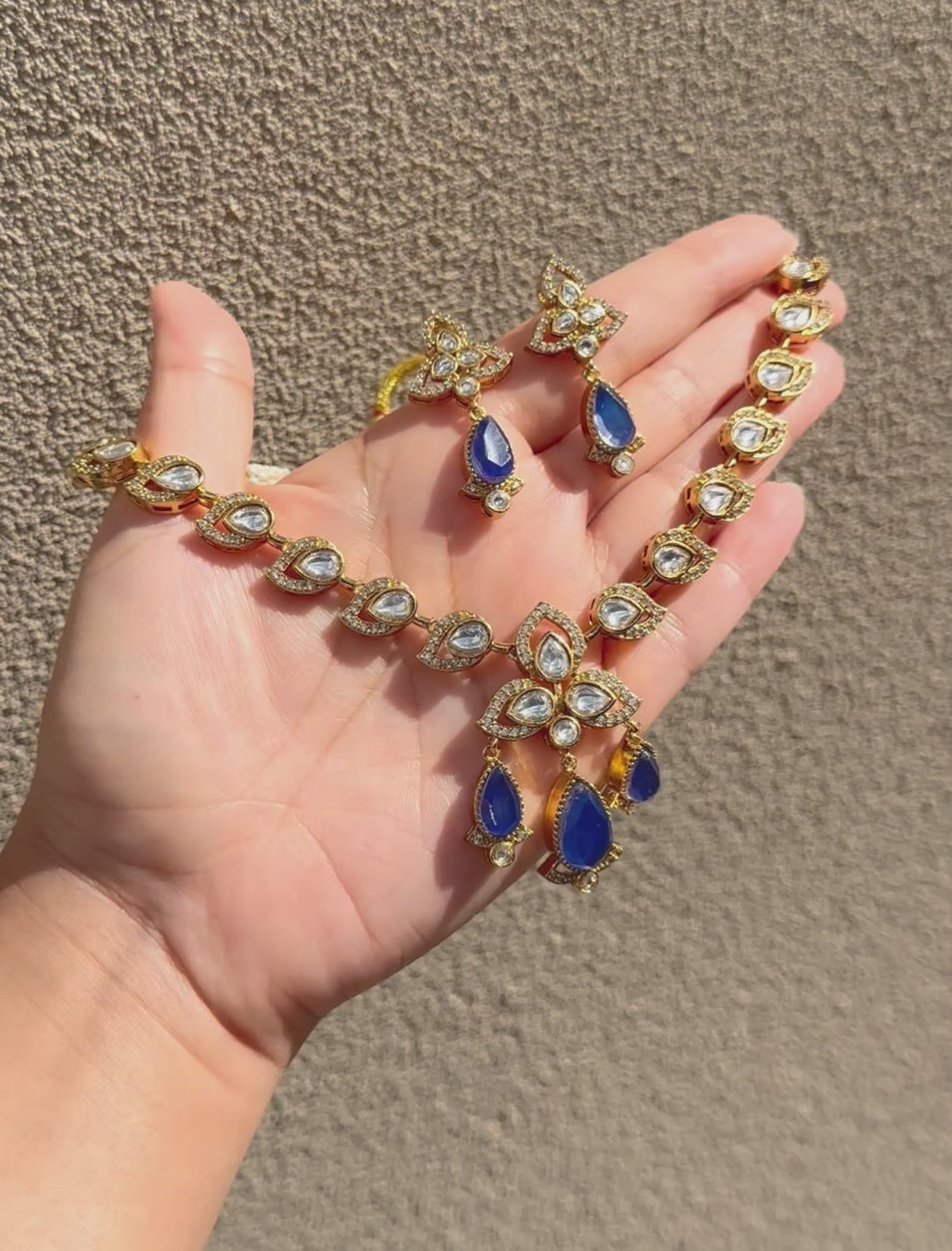 A classic beauty, this necklace set is designed with shimmering doublet stones and American diamonds. Elegant yet versatile, it’s the perfect piece to pair with both traditional attire and contemporary looks.
