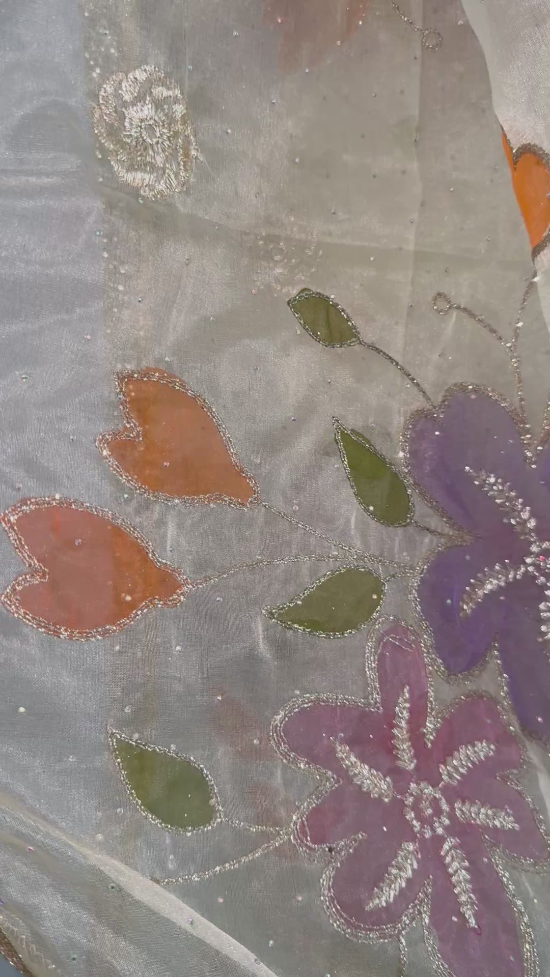 A sheer organza dupatta featuring delicate hand-printed floral motifs with subtle embroidery detailing, creating an elegant and lightweight statement piece for any outfit.