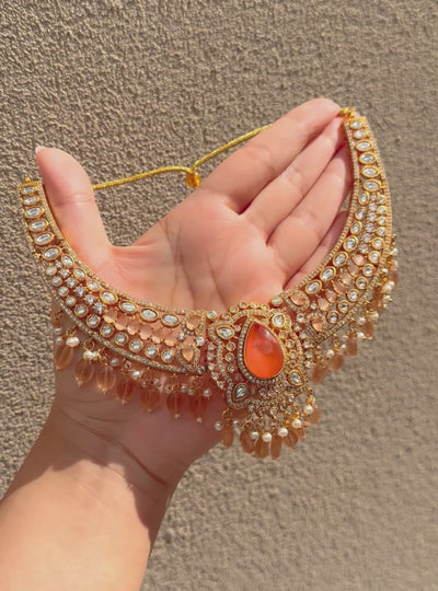 Radiating elegance, the Sadia Necklace Set showcases vibrant doublet stones paired with tyaani accents and pearl details. Designed with a bold centerpiece and matching earrings, this set adds a touch of grandeur to any bridal or festive ensemble.